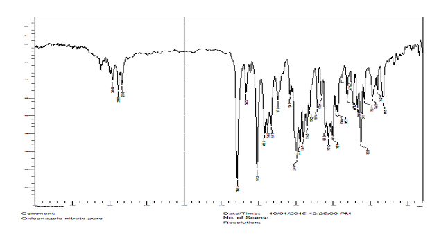 It was determined by Fourier Transform Infrared Spectro-photometer (FTIR-Shimadzu) using KBr pellet method. FTIR spectra of oxiconazole nitrate, physical mixture(s) of oxiconazole nitrate and eudragit S-100, eudragit L-100, carbapol 934 and microsponge formulation were recorded in the wavenumber range of 4000 to 400 cm-1 [11].