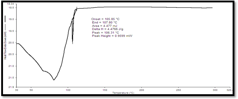Thermal analysis is an important evaluation technique to find any possible interaction between the drug and excipients. Such interaction can be identified by any change in the thermogram. Thermogram of oxiconazole nitrate microsponge formulation was obtained using DSC instrument (PerkinElmer 4000) equipped with an intercooler. Indium standard was used to calibrate the DSC temperature and enthalpy scale. The powder sample of microsponges was hermetically kept in the aluminium pan and heated at a constant rate of 10 ˚C/min, over a temperature range of 30˚C to 300˚C under a nitrogen atmosphere of the flow rate of 20 ml/min [11].