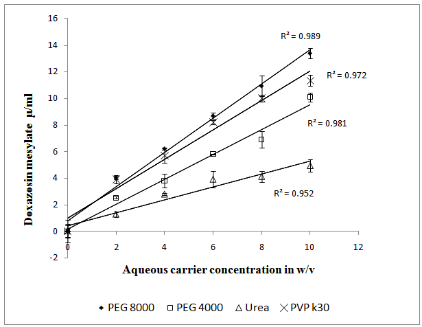 Solubility studies were performed according to method described by Higuchi and Connors [18-19] using different polymers like PVP K30, PEG 4000, PEG 8000 and urea. An excess amount of drug was taken into a screw-capped glass vial to which 20 ml of aqueous solution containing various concentrations (2-10%) of polymer was added. The solvent was equilibrated by shaking for 72 h in a rotary shaker. After attainment of equilibrium, the content of each flask was filtered. The filtrate was diluted suitably and assayed spectrophotometrically at the wavelength of 246 nm using UV-spectrophotometer (Shimadzu UV-1700 PC, Japan). The solubility of drug in different polymers was determined using standard graph.