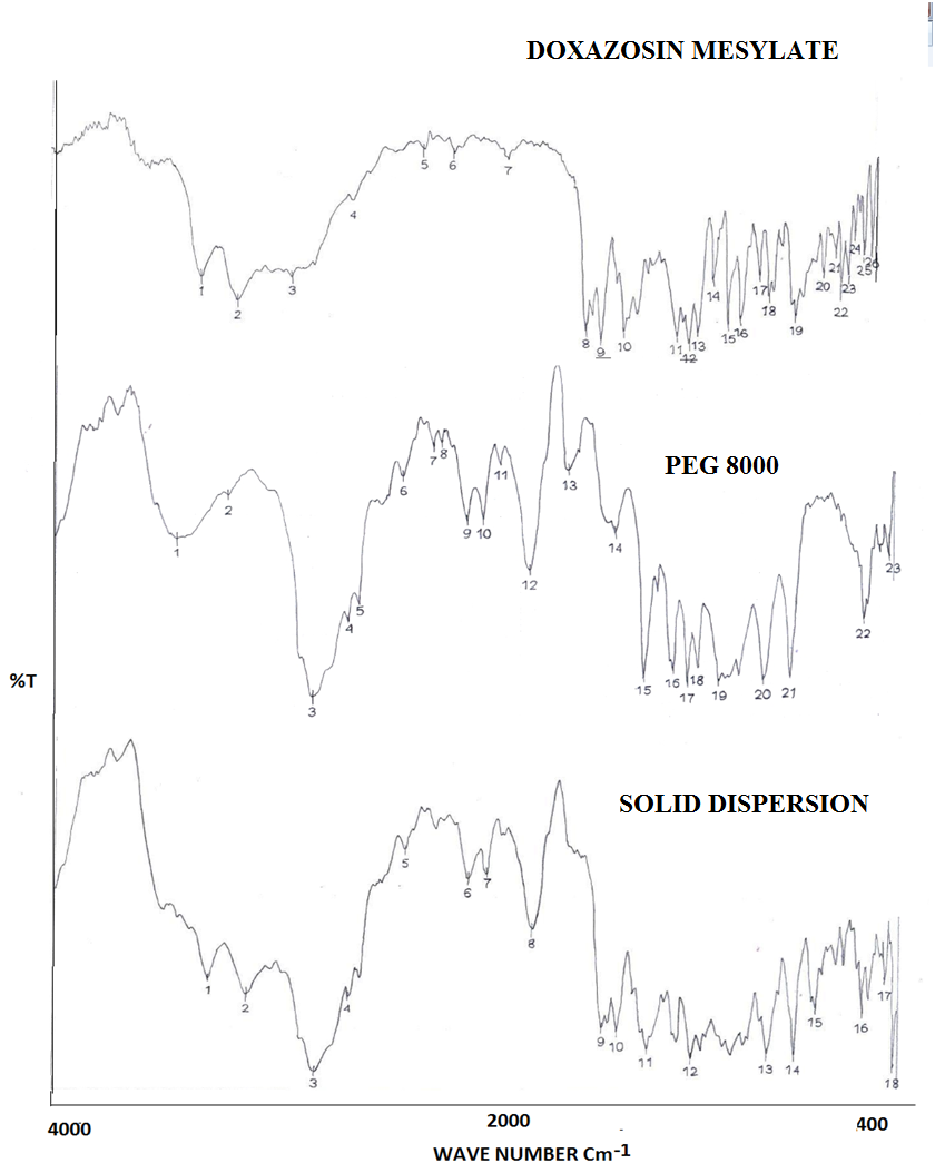 In order to check possible drug-excipients interaction, the infra-red spectra of DM, PEG-8000 and solid dispersion of DM-PEG-8000 were recorded using FTIR spectrophotometer.