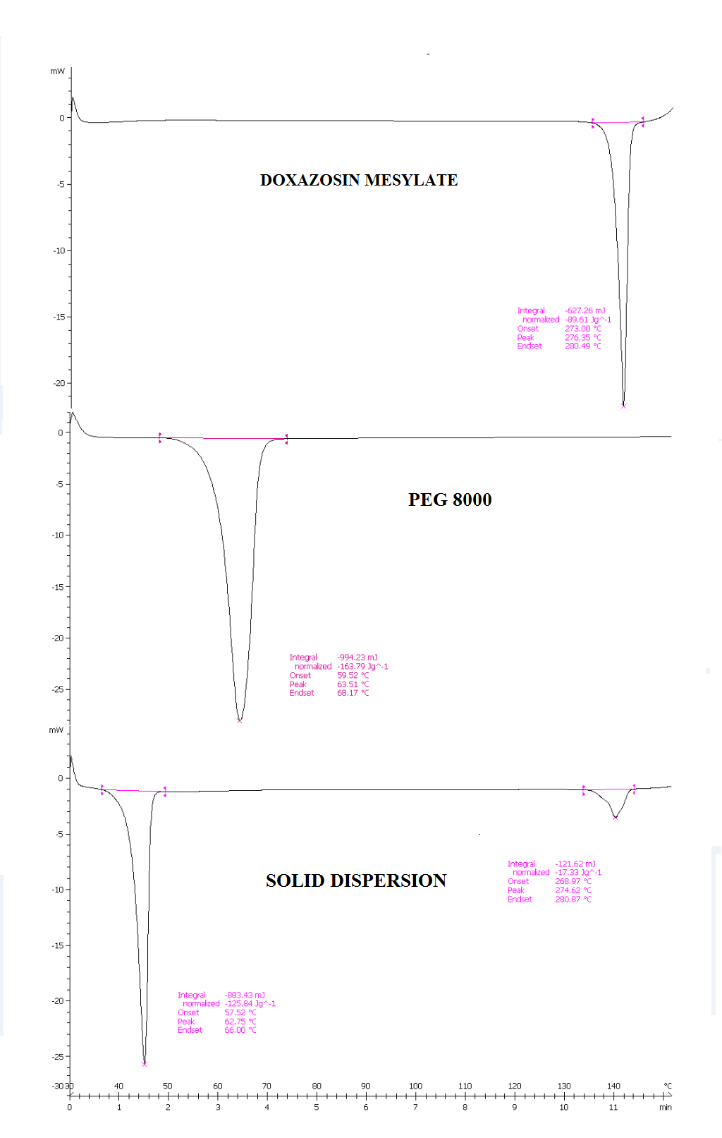 DSC study was carried out to find out the possible interaction between drug DM and polymer PEG-8000. Pure DM powder showed endothermic peak at 276.35 °C with enthalpy of fusion (ΔH) 89.61 J/g and PEG at 63.51 °C corresponding to its melting point. The DSC analysis of solid dispersion reveled negligible change in melting point of DM and PEG-8000 in the drug polymer complex (DM-PEG-8000 solid dispersion). The retention of this characteristic endothermic peak of drug (fig. 3) thus reveals compatibility of the selected drug DM with the polymer PEG-8000.
