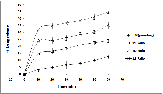 Fig. 4: In vitro dissolution profile of pure drug DM and its solid dispersion with PEG 8000 (n=3)