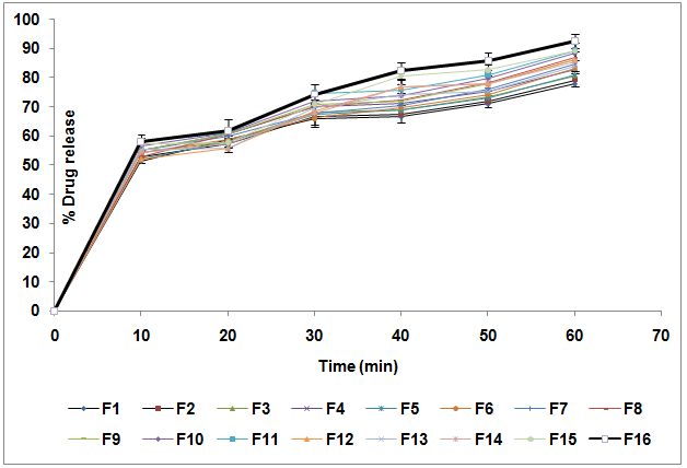 Fig. 5: In vitro dissolution of formulated FDTs (F1-F16) (n=3)