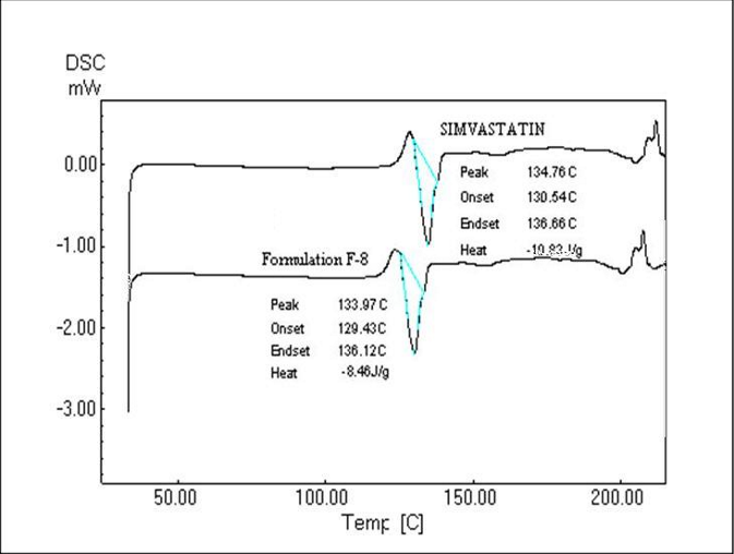 To understand the physical state of the drug, DSC was performed on pure drug and formulation F-8 (fig. 2). The DSC thermogram of the formulations revealed that an endothermic peak of melting of simvastatin at about 134.76 °C was shifted to about 133.97 °C. This suggested that a crystalline form of simvastatin existed in the formulation.