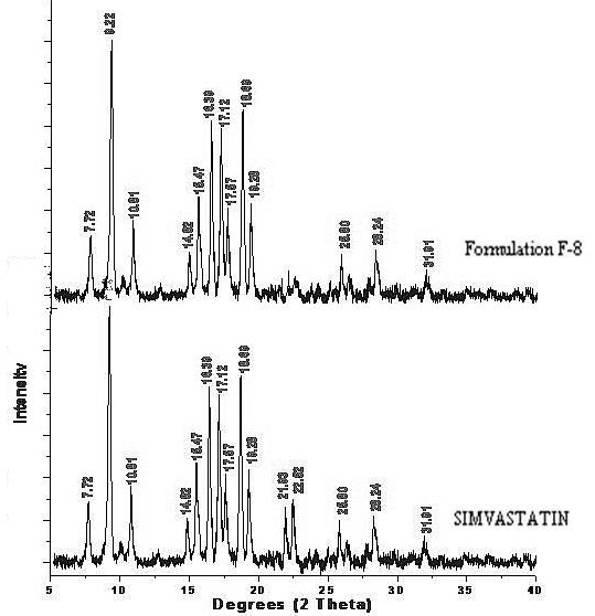 Powder X-ray diffractograms of pure simvastatin and formulation F-8 are shown in fig. 3. The presence of numerous distinct peaks in the x-ray diffraction spectrum indicated that simvastatin was present as a crystalline material with major characteristic diffraction peaks appearing at a diffraction angle of 2θ at 7.72, 8.22, 10.81, 14.82, 15.47, 16.39, 17.12, 17.57, 18.69, 19.28, 21.93, 22.52, 25.80, 28.24 and 31.91. Formulation F-8 showed similar major characteristic diffraction peaks indicating the existence of simvastatin in crystalline form in the formulation F-8.