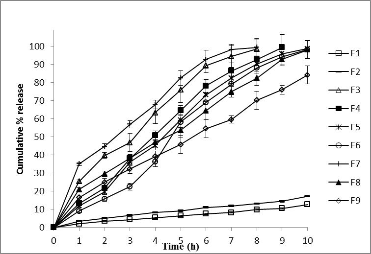 On immersion in 0.1N HCl solution (pH 1.2), 0.5% SLS at 37 °C, the tablets floated and remained buoyant without disintegration. Table 3 shows the results of Buoyancy study. From the results, it was concluded that the batch F1and F2 showed good Total floating time (TFT). Formulation F4 and F5 showed good BLT while the formulation F3 and F7 showed less TFT. And the formulation F8 and F9 showed good BLT as well as good TFT. All the batches of tablets were found to exhibit short BLT due to the presence of sodium bicarbonate and citric acid. The tablets with low-viscosity grade HPMC K4M exhibited short BLT and floated for a longer duration as compared with formulations containing high viscosity grade HPMC K100M. Increasing the concentration of HPMC K4M level in the formulations F3, F4, F5, F6, F8, and F9 prolonged the BLT and the total floating time. Thus a combination of sodium bicarbonate (50 mg) and citric acid (16 mg) with HPMC K4M and HPMC K100M was found to achieve the optimum in vitro buoyancy and float ability.