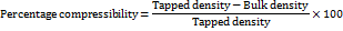 Carr’s index or compressibility ratio of pure drug and prepared granules were calculated by using equation: