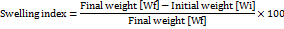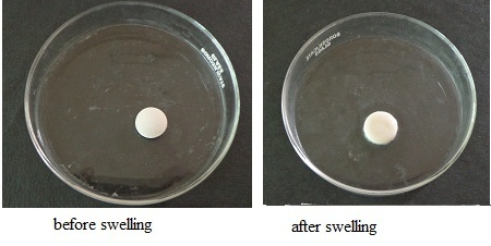 Swelling index of the tablets was calculated by soaking the tablet in phosphate buffer pH 7.4 for two hours by using the equation: