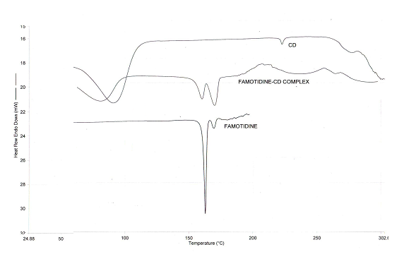 Differential scanning calorimetry (DSC) was performed by Perkin Elmer DSC 6000 to evaluate the prepared complex. DSC thermogram of complex was compared with DSC thermograms of pure drug and pure cyclodextrin.