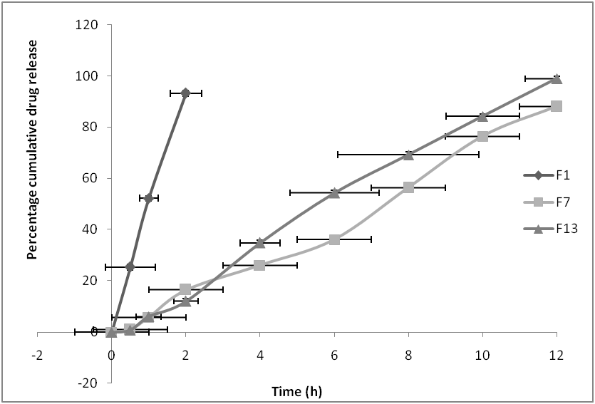 This may be due to a more rigid complex formed by hydrophilic polymers (HPMCK15M) when used in much concentrations along with the presence of EC which helped in retaining the drug in the matrix and did not allowed rapid diffusion of soluble drug from the matrix. Hence the F13 formulation was the best formulation based on controlling the release rate for 12 h and cyclodextrin can be used as a better tool for enhancing the drug release over a long term period in controlled manner.