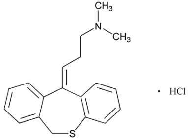 Dosulepin hydrochloride (fig. 1) chemically is 1-Propanamine, 3-dibenzo [b, e] thiepin-11(6H)-ylidene-N,N-dimethyl-, hydrochloride. Dosulepin belongs to the category of drugs referred to as tricyclic antidepressants and having anxiolytic properties. Dosulepin works by preventing serotonin and noradrenaline from being reabsorbed back into the nerve cells in the brain. This helps prolong the mood lightening effect of any released noradrenaline and serotonin. In this way, dosulepin helps relieve depression [1].