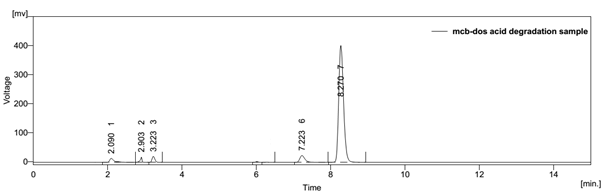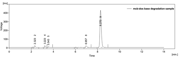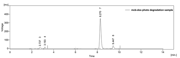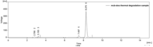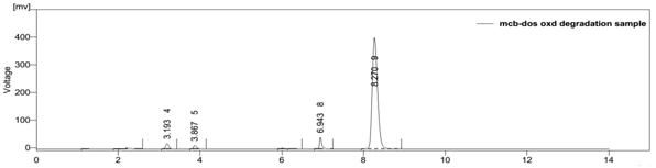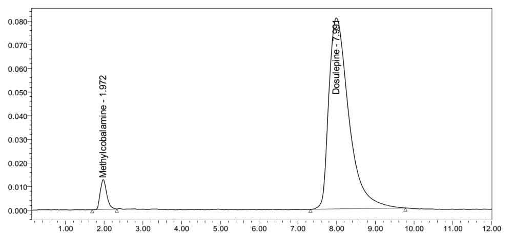 Forced degradation studies were performed to demonstrate the stability of the sample in different stressed conditions. The conditions used were acid and base hydrolysis, dry heat, oxidation and sunlight photolysis. The acid hydrolysis showed little degradation of dosulepin hydrochloride and methylcobalamin with degraded products peaks at retention time 7.223 and 2.903. For alkali degradation, degraded product peak was observed at retention time 6.957 and 3.543. Degradation studies under oxidative conditions gave degraded product peaks at retention time 6.943 and 3.867. For the thermal degradation, peaks were observed at retention time 7.497 and 2.790 for degraded products. In photohydrolysis, degraded product peaks were observed at retention time 9.447 and 2.737.