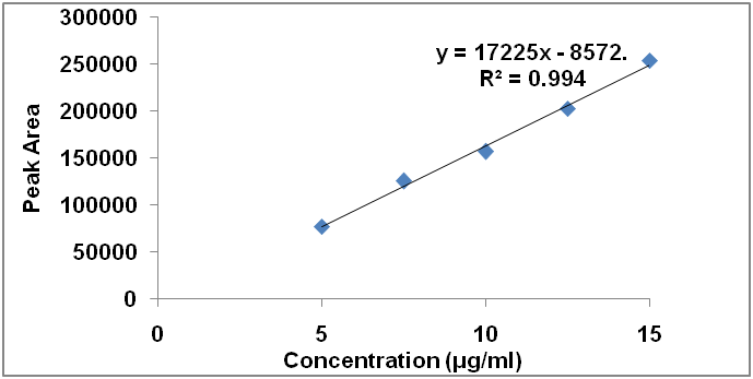 The linearity of the method was determined by assaying dosulepin hydrochloride and methylcobalamin standard stock solution at five different concentrations. Concentrations of dosulepin hydrochloride taken were 165, 247.5, 330, 412.5 and 495 μg/ml and for methylcobalamin 5, 7.5, 10, 12.5 and 15 μg/ml. The calibration curves were plotted between the responses of peak area versus concentration of the analyte. Least-squares linear regression analysis was performed for the calibration curves (fig. 5 and 6). The results have shown an excellent correlation between peak areas and concentration within the concentration range of 165–495 μg/ml for dosulepin hydrochloride, 5–15 μg/ml for methylcobalamin (table 2). The correlation coefficients were found to be 0.999 for dosulepin hydrochloride and 0.994 for methylcobalamin, which meet the method validation acceptance criteria [20-21] and hence the method was said to be linear for both the drugs.