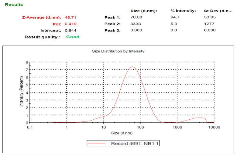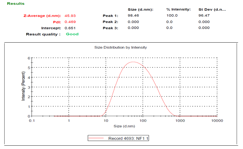 Polydispersity Index (PdI) is a dimensionless measure of the broadness of the size distribution calculated from the cumulants analysis. In the zetasizersoftware, it ranges from 0 to 1 values greater than 1 indicate that the distribution is so polydisperse the sample may not be suitable for measurement by dynamic light scattering. PdI of blank niosomes and optimized niosomes NF2 were found to be 0.419 and 0.469 respectively.