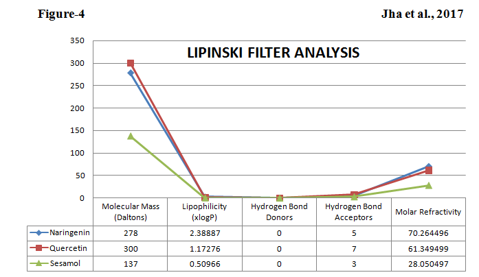 An online tool Lipinski Filter (http://www.scfbio-iitd.res.in/ software/drug design/lipinski.jsp) was used to retrieve the information about drug-likeness properties of Biomolecules with the help of Lipinski rule of five. Lipinski rule helps to differentiate drug and non-drug like properties of molecules. It is used to identify the possibility of success or failure due to drug-likeness for molecules fulfilling with two or more of the following rules: (a) Molecular Mass should be less than 500 Dalton, (b) High Lipophilicity (expressed as logP less than 5), (c) Less than 5 hydrogen bond donors, (d) Less than 10 hydrogen bond acceptors and (e) Molar refractivity should be between 40-130.