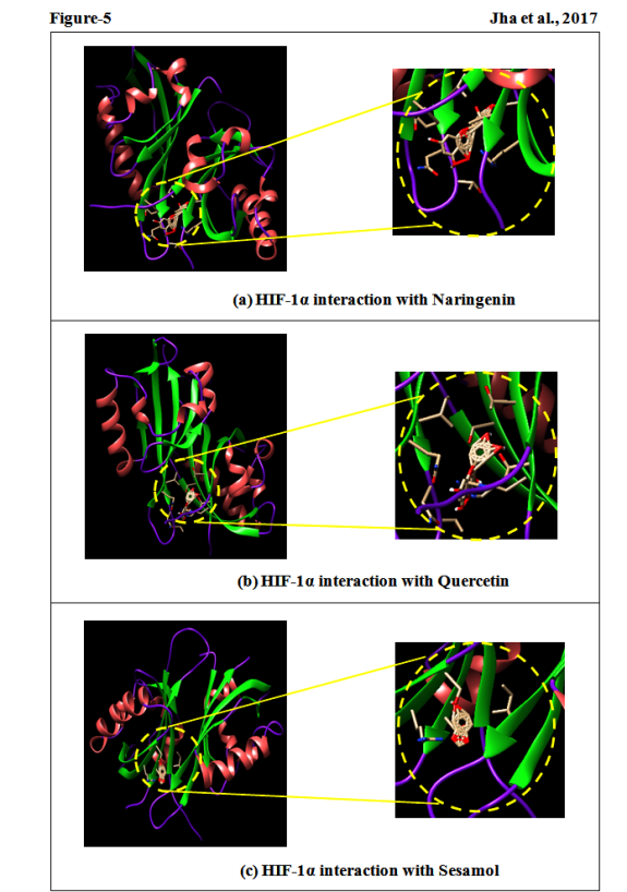 all the biomolecules are having minimum binding energy and have good affinity toward the active pocket, thus, they may be supposed as good inhibitor of HIF-1α. Inhibition Constant, Ki of Naringenin, Quercetin and Sesamol for HIF-1α was found to be 605.40 nM, 945.18 nM and 174.23 µM respectively, advocating that all the selected compounds are effective as HIF-1α inhibitors. Additionally, investigation of active and binding sites within HIF-1α protein gives a better idea for a valuable drug target site and drug interaction with the highest affinity. Finally, in this result the most effective compound was found to be Naringenin as showing minimum inhibition constant, Ki and highest negative free energy of binding with the maximum interacting surface area. Thus, the role of natural compound Naringenin with HIF-1α provides a novel remedial approach among all three biomolecules based on docking studies and provide a potential curative biomarker for the treatment of patients suffering from hypoxic injuries.