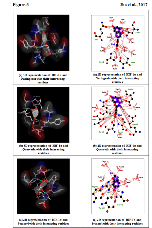 Binding site residues of HIF-1α interacting with Naringenin, Quercetin and Sesamol were found to be the same as the residues involved in their respective catalytic sites. Interacting residues of HIF-1α with Naringenin, Quercetin and Sesamol along with their identified catalytic sites have been shown in (table 6) and their 2D and 3D pattern of interaction is presented in (fig. 6).
