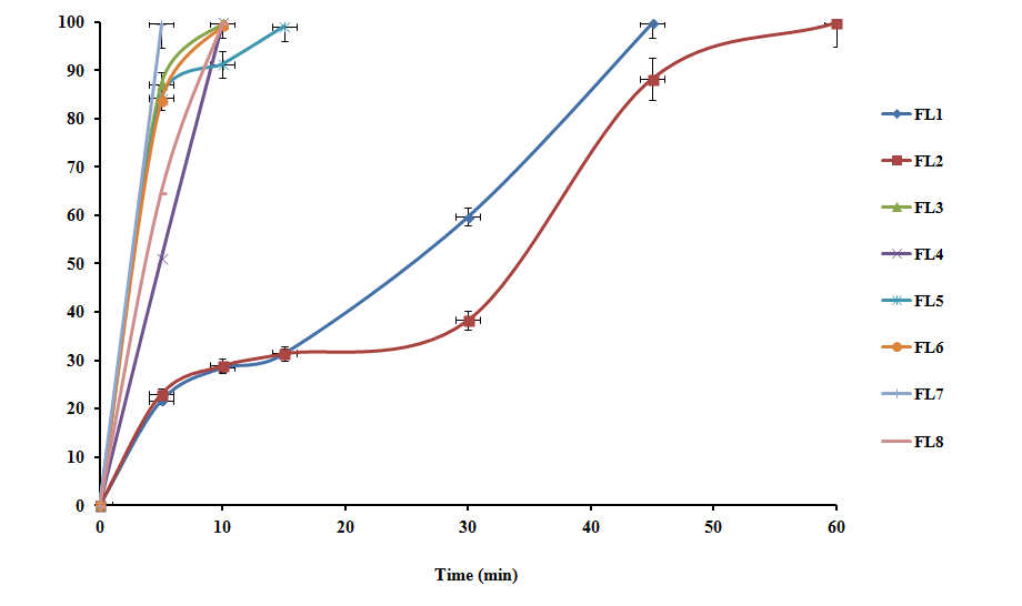 Fig. 9: Dissolution profiles of ibuprofen fast dissolving tablets prepared employing starch xanthate involving lactose as a diluents, (FL1-FL8) (n=6, mean±SD)