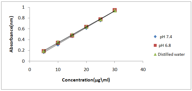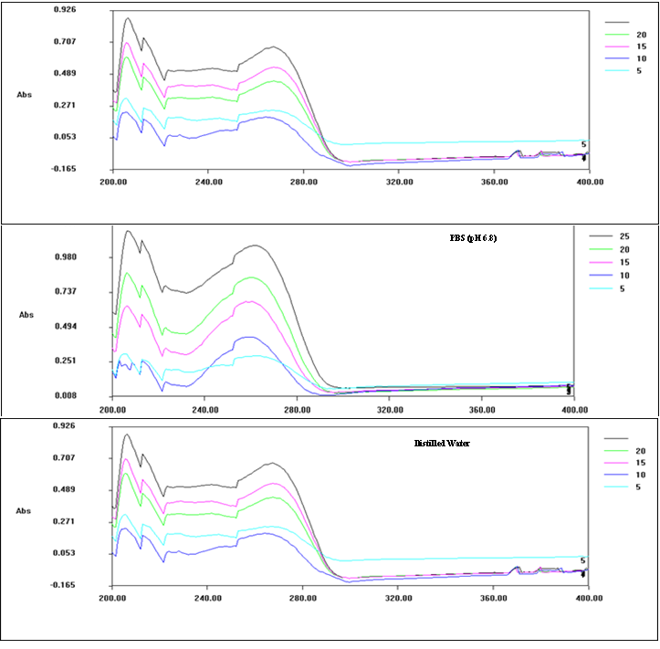The standard solutions were prepared by the proper dilution of the primary stock solution with phosphate buffer pH 7.4, pH 6.8 and distilled water to obtain working standard. All the measurements were performed at room temperature. The stock solutions scanned in the UV range 200-800 nm by using an appropriate blank. For linearity study, dilutions were made for the drug in the range of 1-40 µg/ml concentrations were prepared by diluting the stock solution with all the three working solvents.