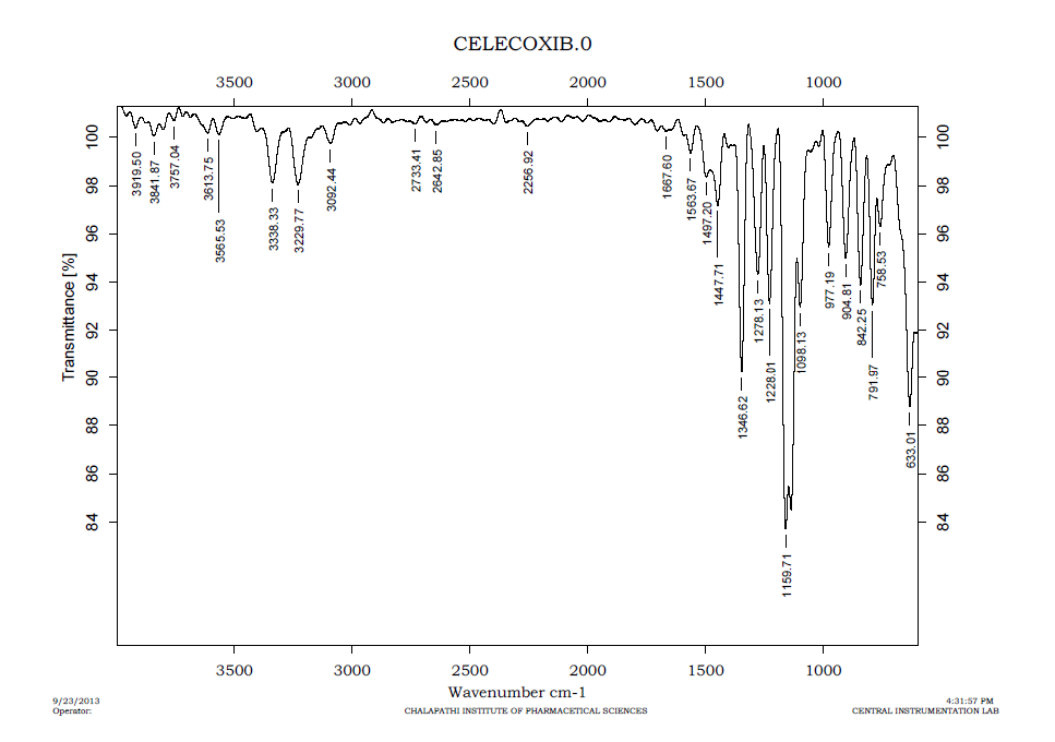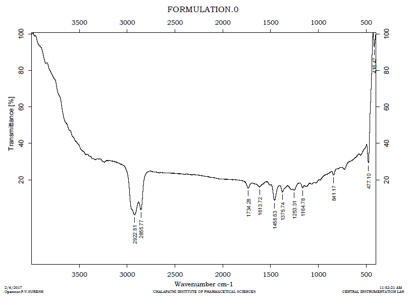 FTIR spectroscopy of drug, polymers and physical mixture was performed using fourier transform infrared spectrophotometer (BRUKER, ALPHA). The sample was taken and by using potassium bromide, pellets were prepared using hydraulic pellet press and the spectrum was taken.