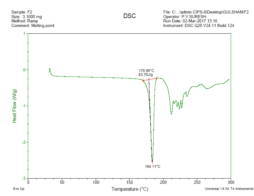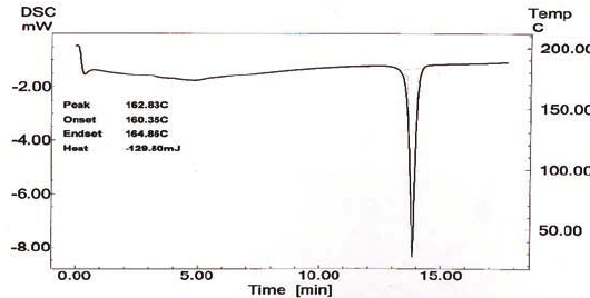 DSC studies were performed using a universal V4.5A TA instruments. Accurately weighed samples (about 3 mg) were placed in a sealed aluminium pan, before heating under nitrogen flow (20 ml/min) at a scanning rate 20 °C/min from 40 to 300 °C. An empty aluminium pan was used as reference. DSC thermograms of pure substances, their physical mixtures and drug loaded microspheres were recorded.