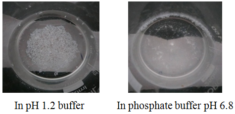 Prior to dissolution, in order to know about the stability of the microspheres at gastric pH, a study was conducted to determine the enteric capacity of the polymer, where the formulation was equally weighed and placed in 100 ml of each pH 1.2 buffer and phosphate buffer pH 6.8 for 2 h and it was observed that the microspheres in the beaker with pH 1.2 buffer as the medium remained as such where as those in beaker with phosphate buffer pH 6.8 were dissolved gradually as the time prolonged. They are shown in fig. 11. As the concentration of eudragit was increased the drug release in acidic pH was found to be reduced and the the presence of HPMC made the prolonged release up to 6 h.