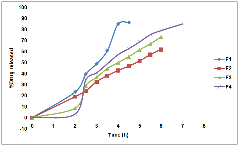 Results: Drug and polymer interactions were evaluated by using FTIR and DSC. The FTIR spectrum and DSC thermograms stated that drug and polymer are compatible to each other. The micrometric properties of drug loaded microspheres were carried out and they were found to be as the angle of repose (18.26 °-40.69 °), bulk density (0.2846-0.3875), tapped density (0.4111-0.5428), Carr’s index (9.66-14.77), Hausner’s ratio (1.112-1.2642) which were within the limits. In vitro dissolution, drug release was found to be from 4.5 to 6.5 h for the prepared four formulations (F1–F4). From the kinetic data modeling the order of drug release was found to be zero order and korsmeyer-peppas with n value above 0.5 for all the formulations indicating non-fickian diffusion.