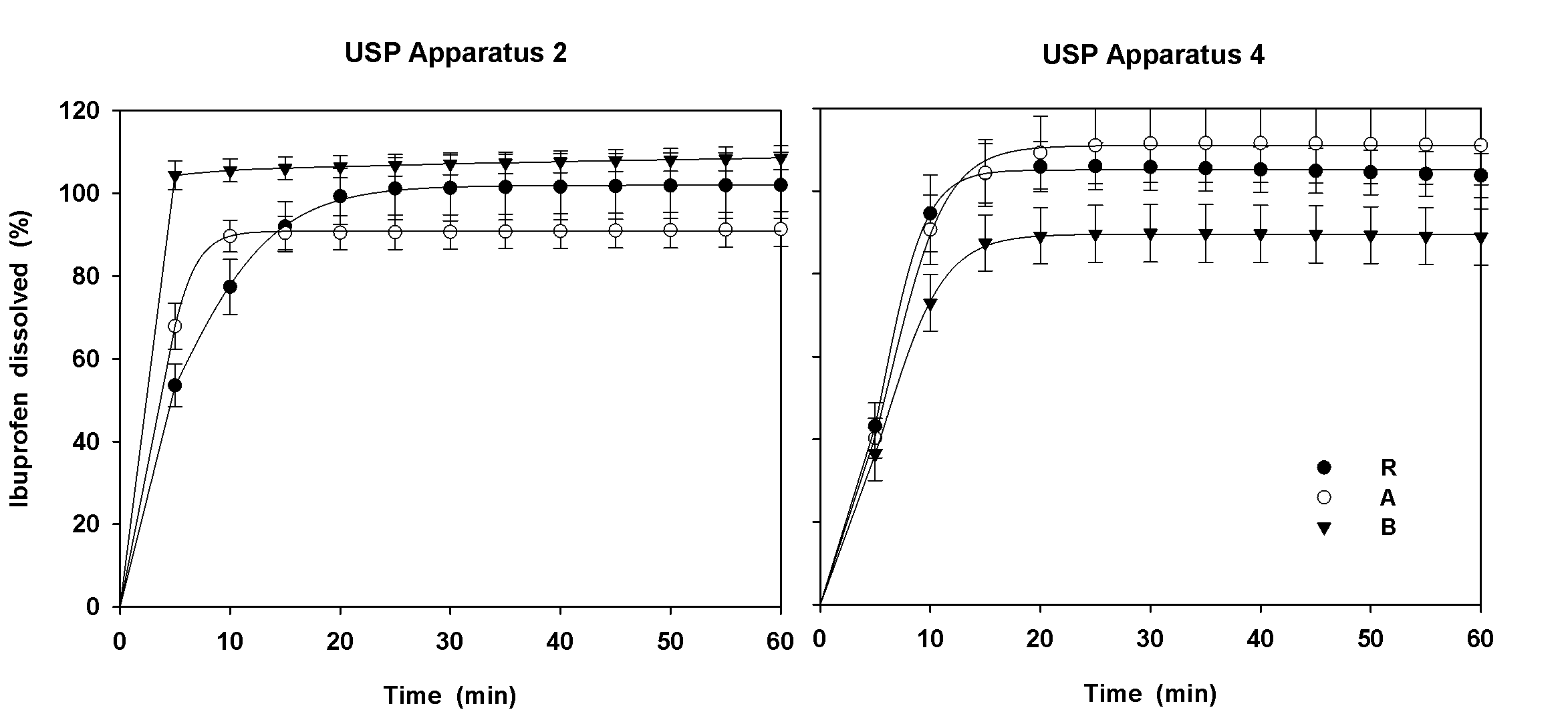 The dissolution data of the reference and generic product B, were well fitted to the Weibull function when using USP Apparatus 2 and 4. Both products reached the highest values of R2adjusted and the lowest values of AIC. The dissolution data for the generic product A were well fitted to the Gompertz function and probit equation, when using the USP Apparatus 2 and 4, respectively. None of the ibuprofen data was well fitted by the logistic model.