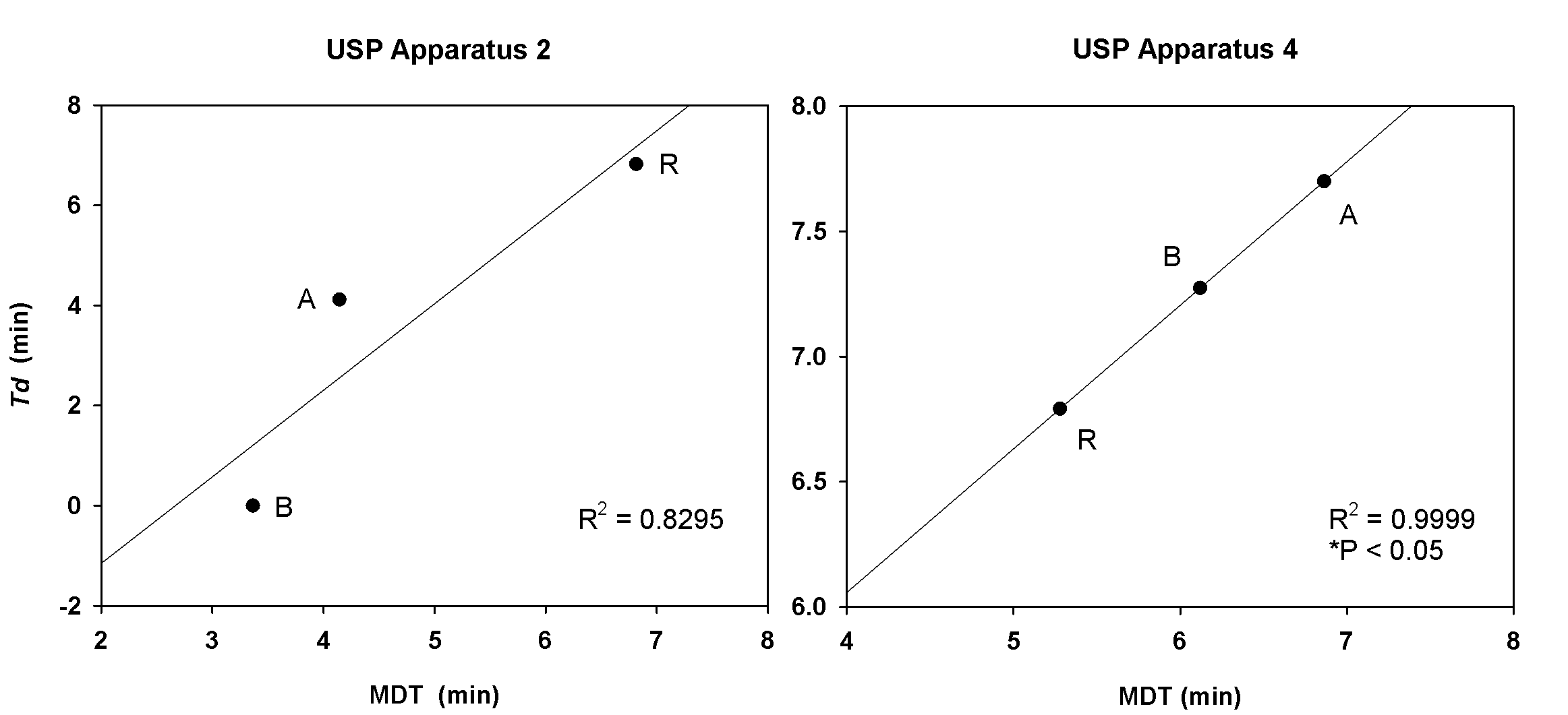 The Weibull shape parameter β characterizes the dissolution profile as exponential (β = 1); as sigmoid S-shaped, with upward curvature followed by a turning point (β>1); or as parabolic, with a steeper initial slope that is consistent with the exponential (β<1) [26]. The in vitro release of ibuprofen from the three drug products showed β values>1, meaning sigmoidal profiles excepting the generic product B under the hydrodynamic environment of USP Apparatus 2. By the obtained results, the in vitro release of ibuprofen from suspensions seems not to be the same in the USP Apparatus 2 and 4. To confirm this result, the MDT and Td values were separately plotted by dissolution apparatus. Results are shown in fig. 2.