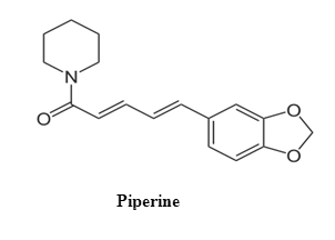 Piperine is (1-piperoylpiperidine) as shown in fig. 1, an active alkaloid of Piper longum and Piper nigrum (Piperaceae) [7, 8]. It exhibits CNS depressant, antipyretic and anti-inflammatory activity [9]. It has been reported that piperine enhances the bioavailability of several drugs through inhibition of drug metabolism such as curcumin [10, 11]. Methods are available for the analysis of piperine [7, 12].