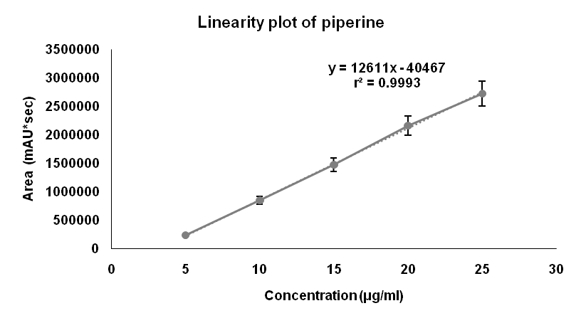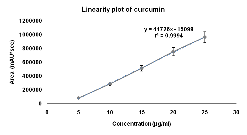 The linearity was evaluated at five concentration levels in the range between 5-25 µg/ml for both curcumin and piperine. The calibration curve was plotted by plotting concentration against its corresponding peak area, and linearity was determined using least square regression analysis. The slope value and correlation coefficient (r2) values were calculated separately for each drug.