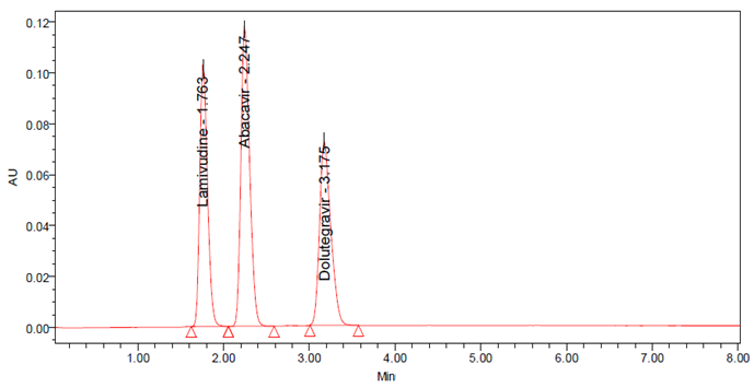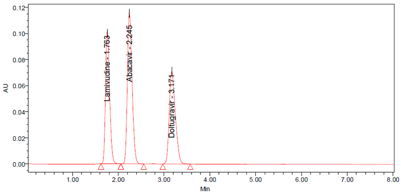 Results: The retention time (Rt) for lamivudine, abacavir and dolutegravir were 1.763, 2.247 and 3.175 min respectively. A good linear response was obtained in the range of 15-75 µg/ml, 30-150 µg/ml and 2.5-12.5 µg/ml, respectively. The Limit of Detection (LOD) values were found to be 0.021, 0.330 and 0.038 µg/ml, respectively and the Limit of Quantitation (LOQ) values were 0.056, 1.320 and 0.095 µg/ml, respectively.