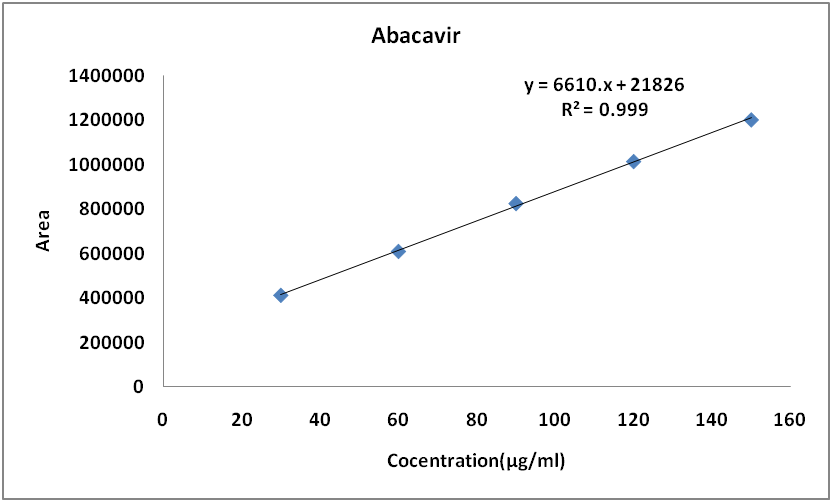 Calibration plots for the analytes were prepared with standard stock solutions to yield the concentration ranges of 15-75 µg/ml for lamivudine, 30-150 µg/ml for abacavir, 2.5-12.5 µg/ml for dolutegravir into the UPLC system. In between the ranges given above, five concentrations were taken and triplicate injection of each concentration was performed.