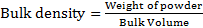 Weigh accurately 10 g of powder, which was previously passed through a 20# sieve and transferred into 100 ml graduated cylinder. Carefully level the powder without compacting, and read the unsettled apparent volume. Calculate the apparent bulk density in g/cm3 by the following formula [9].