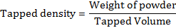 Weigh accurately 10 g of powder, which was previously passed through a 20# sieve and transfer in 100 ml graduated cylinder. Then mechanically tap the cylinder containing the sample by raising the cylinder and allowing it to drop under its own weight using mechanically tapped density tester that provides a fixed drop of 14±2 mm at a nominal rate of 300 drops per minute. Tap the cylinder for 500 times initially and measure the tapped volume (V1) to the nearest graduated units, repeat the tapping an additional 750 times and measure the tapped volume (V2) to the nearest graduated units. If the difference between the two volumes is less than 2%, then final the volume (V2). Calculate the tapped density in g/cm3 by the following formula [9].