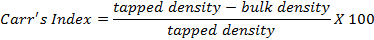 Compressibility index is used as an important parameter to determine the flow behaviour of the granules. It is indirectly related to the relative flow property rate, cohesiveness and particle size. It is simple, fast and popular method for predicting flow characteristics. Carr’s index can be represented by the equation [10]: