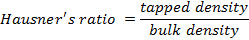 Hausner’s ratio is used to predict the flowability of the granules. This method is similar to compressibility index. Hausner’s ratio can be represented by an equation as shown below [10]:
