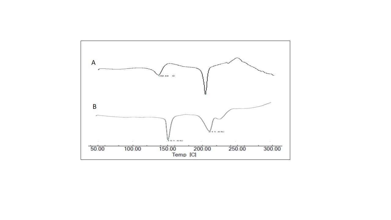 The possibility of drug–excipient interaction was investigated by DSC. It allows the fast evaluation of possible incompatibilities because it shows changes in appearance, shift or disappearance of melting endotherms and exotherms, and/or variations in the corresponding enthalpies of reaction. The DSC thermograms of pure drug, a mixture of the drug with GG and XG, starch and lactose were recorded. The samples were separately sealed in aluminium cells and set in a DSC-60 instrument (Shimadzu Corporation, Tokyo, Japan). The thermal analysis was performed in a nitrogen atmosphere at a heating rate of 20 °C/min over a temperature range of 50 to 300 °C [3-4].
