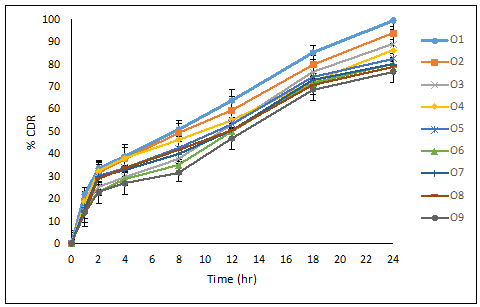 Fig. 2: % cumulative drug release study of batches O1 to O9 (n = 6)