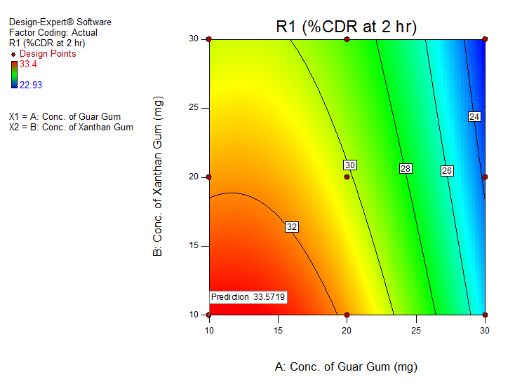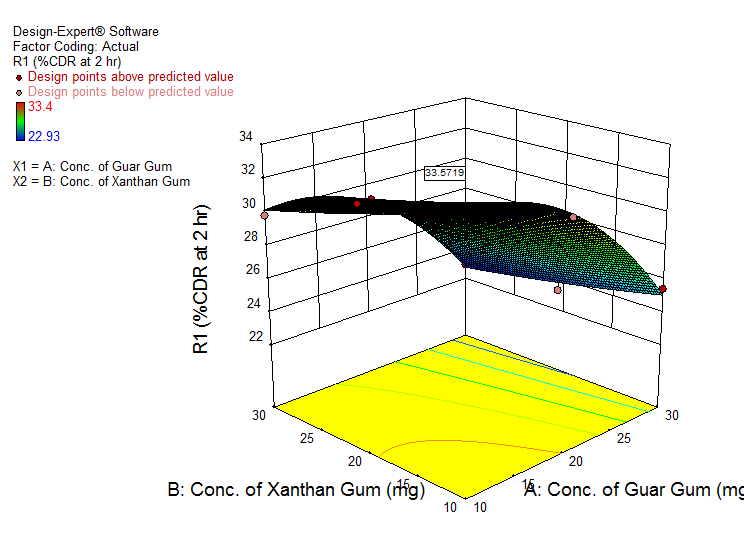 Mathematical relationships generated for the studied response variables concentration of GG (X1) and concentration of XG (X2) for %CDR at 2 h (Y1) is as follows: