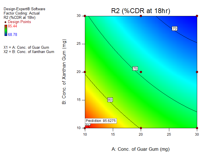 A checkpoint analysis was performed to confirm the role of the derived polynomial equation and contour plots in predicting the responses. Values of independent variables were taken at 3 points and the theoretical values of % CDR at 2 h and %CDR at 18 h were calculated by substituting the values in the polynomial equation [3, 15-16].