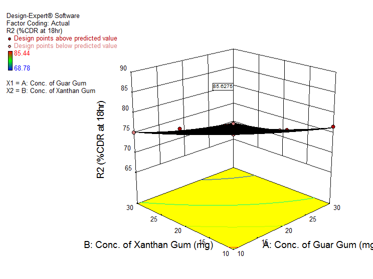 Mathematical relationships generated for the studied response variables concentration of GG (X1) and concentration of XG (X2) for %CDR at 18 h (Y2) is as follows: