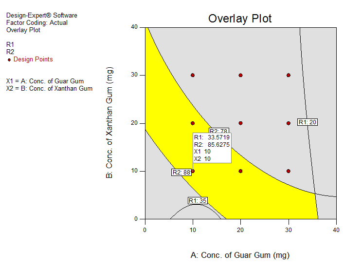 The overlay plot of responses, generates an optimized area as per desired criteria as shown in fig. 5. This was the most important part of the response surface methodology. After studying the effect of the independent variables on the responses, the levels of these variables that give the optimum response were determined. The optimum formulation was selected based on the criteria of attaining complete and controlled drug release. Batch O1 having 10 mg of GG and 10 mg of XG fulfilled maximum requisites of an optimum formulation because of better regulation of release rate. The said formulation released 33.57 % of the drug in 2 h and 85.62 % in 18 h, however, the drug completely got released, i.e. 99.82 % in 24 h, which were in close agreement with the theoretical values [18].
