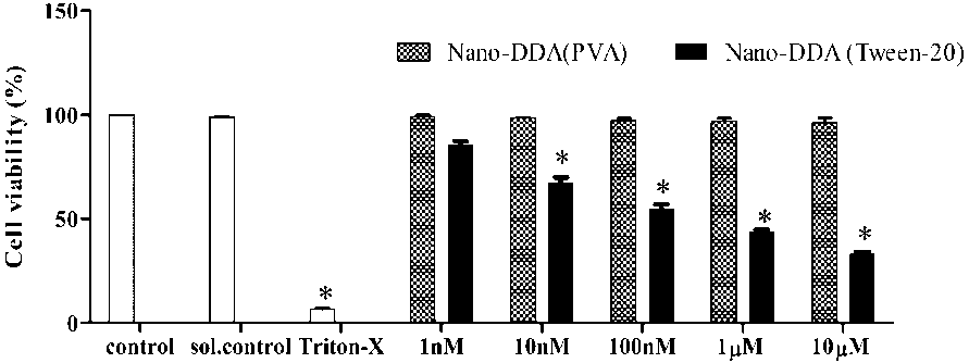Fig. 1: Cell viability of nano-DDA (PVA) and nano-DDA (Tween-20) using MTT assay. The values are mean±SD, (*) p<0.05 as compared with control, sol. control-Solvent control
