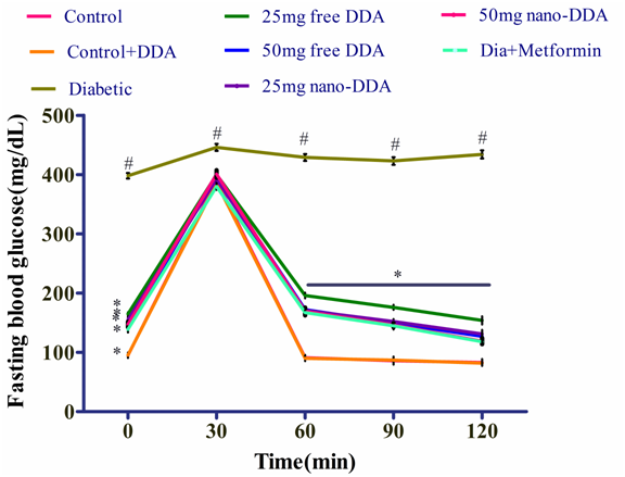 Fig.2: Effect of free and nano-DDA on Oral glucose tolerance test in streptozotocin-nicotinamide-induced diabetic rats. Data represented as mean±SD, n=5.*p<0.05 as compared with diabetic group, #p<0.05 as compared with control, dia-diabetic
