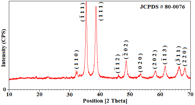 Where D is the crystallite size, λ is the wavelength (1.5406 A ° for Cu Kα) of the X-ray radiation, β is the full width at half maximum of the peaks at the diffracting angle θ[21]. Crystallite size wascalculated to be 19 nm. According to JCPDS data (80-0076), the exhibited diffraction peaks at 2θ = 32.51 ° (1 1 0), 35.53 ° (-1 1 1), 38.75 °(111), 46.28 ° (-1 12), 48.76 ° (-2 02), 53.58 ° (0 2 0), 58.31 ° (2 0 2), 61.58 ° (-1 1 3), 66.24 ° (-311) and 68.08 ° (2 2 0) corresponds to different planes ofmonoclinic phase of CuOnano particles(table 1). The lattice parameters of CuO sample were calculated from the XRD data. The evaluated cell parameters were a = 0.46891 nm, b = 0.34214 nm, and c = 0.51276 nm in agreement with the reported values.