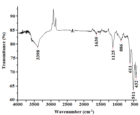 The FTIR spectrum of CuOnanopowderwas shown in fig. 2. TheCuO nanoparticles exhibited vibrational modes at 432 cm-1, 511 cm-1 and 611 cm-1were assigned for Cu-O stretching vibration, rocking vibrational mode of water molecule at 886 cm-1, the band at 1125 cm-1 indicates triply degenerative ν3 mode of SO4-2ion and the absorption bands at 1630 cm-1and 3398 cm-1were bending and stretching mode of vibration of watermolecule(table 2).