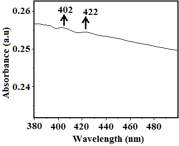 The optical properties of CuO nanoparticles have been studied by UV-Vis spectrum, which was shown in fig. 3. UV-Visible spectroscopy is amost widely used technique to investigate the optical properties of the particles. The analysis was done in the range of 200-800 nm. Two bands were observed at 402 nm and 422 nm, assigned to the absorption of copper oxide nanoparticles.