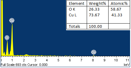 Fig. 4 a shows the SEM images of the nanomaterial. The surface morphology of the synthesized CuO nanoparticles wasflower-shaped structure examined by SEM analysis. The Energy dispersive spectra of the sample were carried out to examine the purity and chemical composition of the synthesized materials.As seen in fig. 4 b, the EDS spectrum contains only elemental copper (Cu) and oxide (O) and no other elemental impurity was observed.