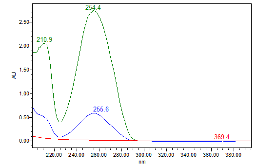 By using photodiode spectrophotometer the absorption spectra of the solution of the three drugs in acetonitrile were scanned in the UV region 200-400 nm against acetonitrile as blank and spectra are shown in fig. From the fig. the spectra of the diethylcarbamazine citrate, guaiphenesin and chlorpheniramine maleate shows different λmax viz. 254.5, 255.6 and 369.4 nm respectively. By considering the chromatographic parameter, sensitivity and selectivity of a method for three drugs 210 nm was selected as the detection wavelength for HPLC chromatographic method.